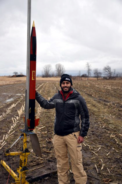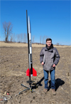 Arun C. got his Level 1 certification with his custom red black and gold rocket called "NUSC In Amber Clad" using a CTI H152 Blue Streak motor at our St. Albans field on Mar. 4, 2018.