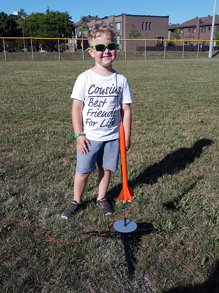 Dave and Molly's 5 year old grandson Matty L. launched his first rocket, an Estes Tigres which he built himself. Flight was conducted in Montreal on July 14, 2020 because of Covid-19 US/Canada border closure. Matty used an A8-3 motor for a picture perfect launch and recovery. Matty is the club's youngest rocketeer. Flight video is HERE
