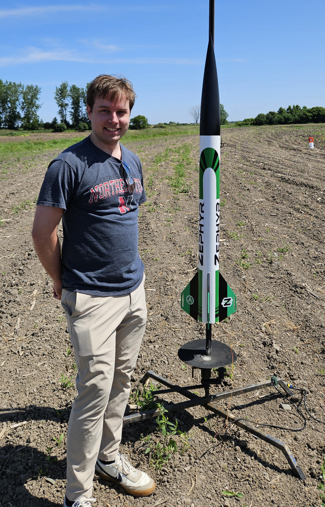 Jonathan H. got his L1 certification with his "Fired Up" Apogee Zephyr rocket on an Aerotech H100 White Lightning motor at our St. Albans field on June 21, 2025.