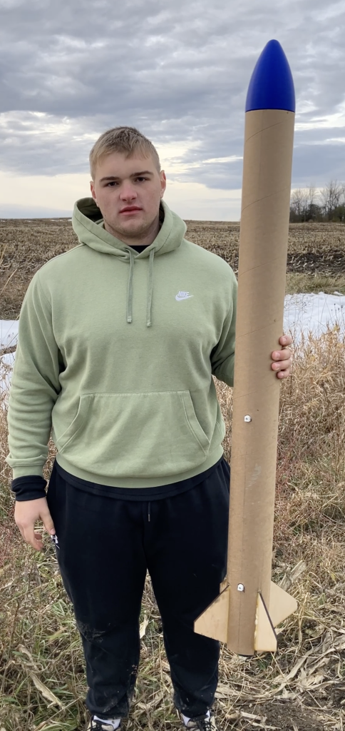 Noah K. got his L1 certification with his custom Sky Shooter rocket on an Aerotech H219T Blue Thunder DMS motor at our St. Albans field on March 16, 2024. Launch video is HERE