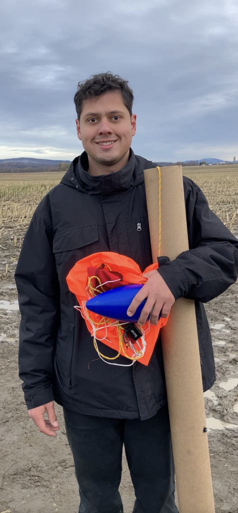 Matheus W. got his L1 certification on his custom "Goias" rocket on a CTI H53 Mellow motor at our St. Albans field on November 15, 2025.